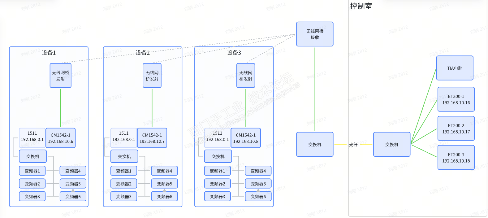 现场有三台同样的设备,设备CPU为1511,设备内有6台ABB的变频器,PLC与变频器之间走PN通讯控制,现在新增需求,在控制室内新增控制台,对三台设备进行远程控制,初步的构想如下图所示: