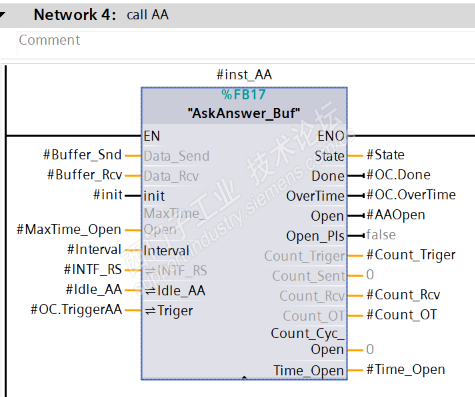 图1是一个用于发送和接收数据的AA,这个AA是在USS通讯中使用的。(项目中用到USS通讯未使用西门子库中的功能。USS通讯由笔者通过PTP自由编程实现。其中图1中的AA就是一环。)