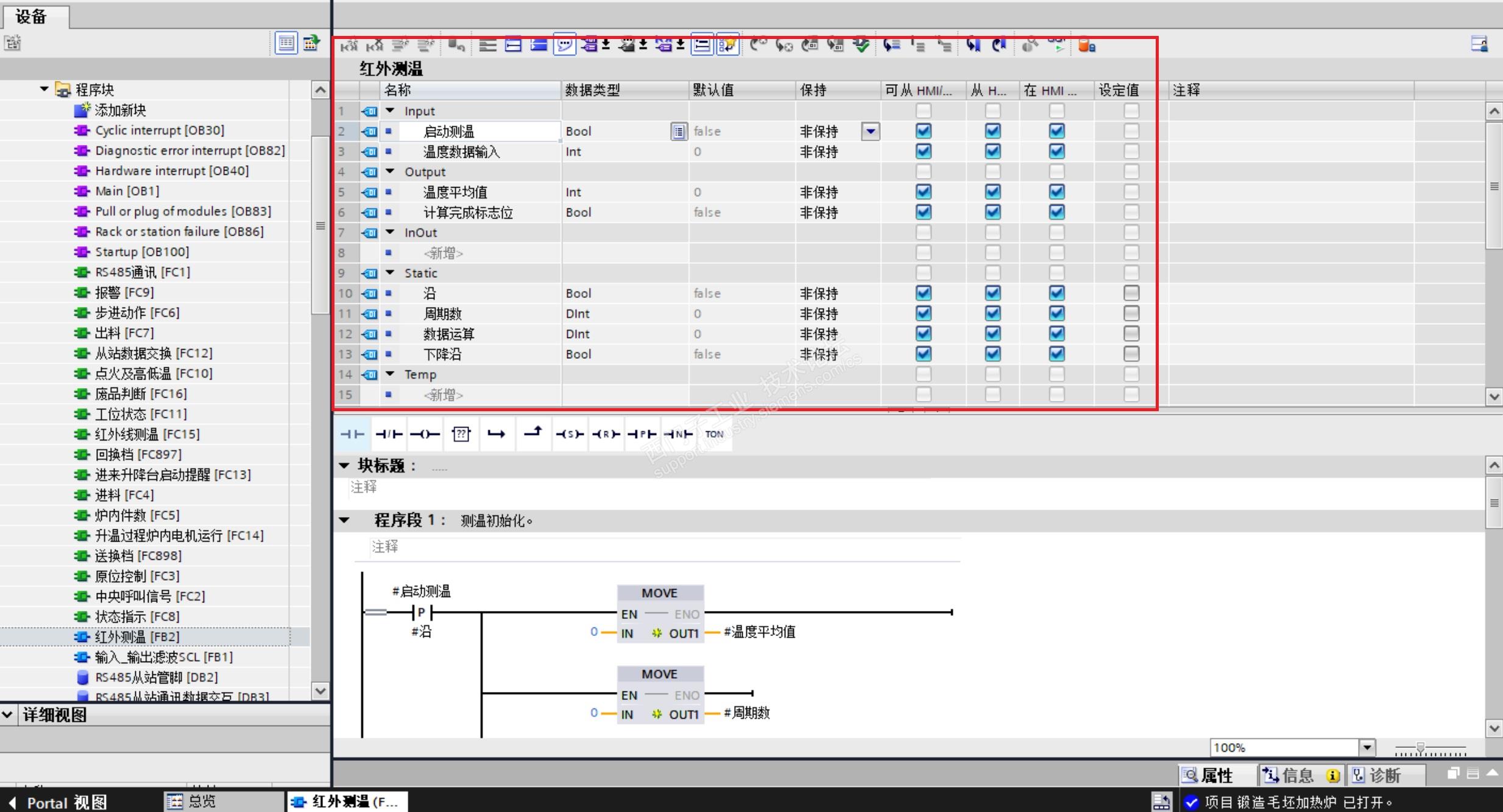 由于按此方法用红外线传感器读取到的实际温度值,仍然会超出工艺要求的±10摄氏度以上,做出一个这样的判断程序,就是说到测量到且已经通过求平均值程序“处理”后,温度仍然超出的测量,用一个虚拟的数据输出,因为实际现场用手持式测温,连续的2天人工测量记录比较,实际的温度值每次都在一个相对稳定的±6摄氏度范围内变化,我用一个虚拟的温度值替代,也不可为是一种目前红外线传感器特性还没有到达目前工艺要求前提下的一种折中的方法。