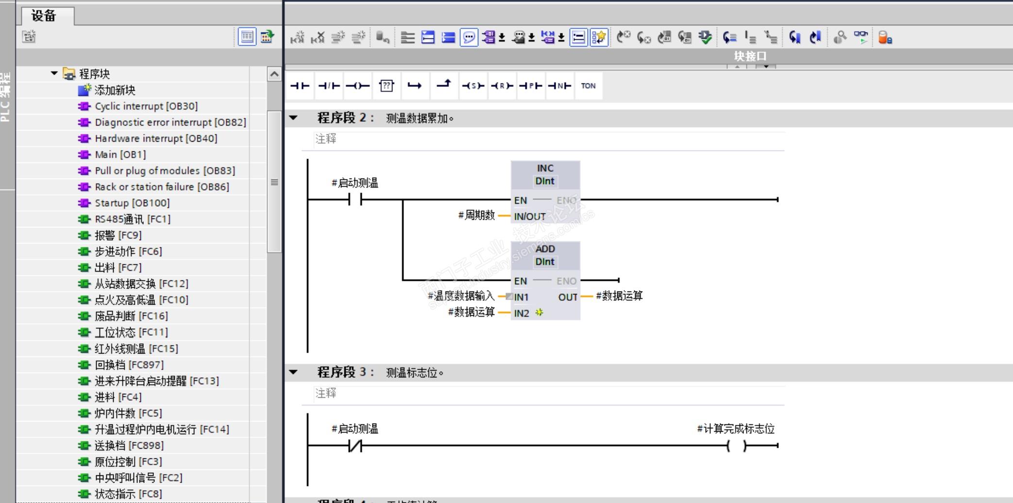 1)首先,我在不影响工艺节拍的前提下,我尽可能的在测量温度时,把被测铝棒毛坯处于一个相对停止稳定的状态下开始测温。控制程序是自铝棒毛坯出料后,进入的出料升降辊道末端后,末端光电检测到铝棒毛坯有料后延时1秒的上升沿,作为测温的开始条件。