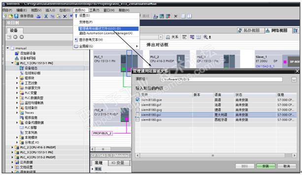 2) 打开TIA博途软件,使用主菜单命令“选项”->“管理通用站描述文件”,在弹出的对话框中选择需要