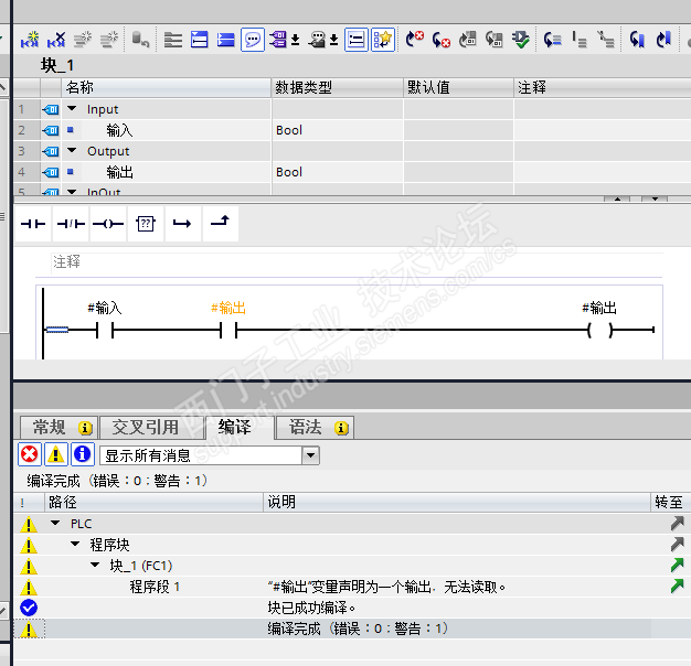 接口里面的OUTPUT类型不能在程序里面当触点用,编译的时候会警告,具体执行时会不会出错就不知道了。