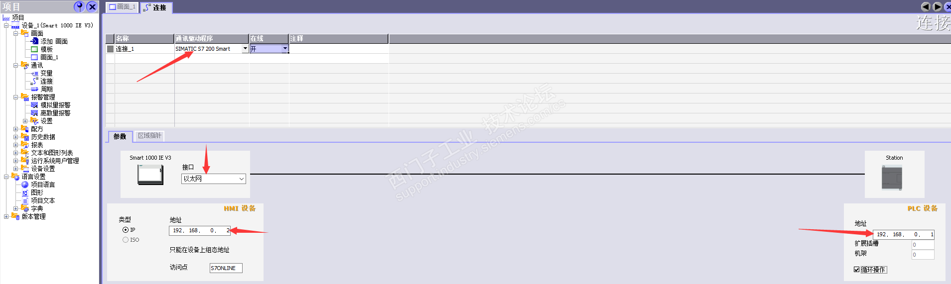 打开WinCC flexible SMART V3软件,在通讯里面,点击连接,添加一个连接,通讯驱动程序选择200SMART。参数一栏选择以太网,IP地址设置好,例如触摸屏:192.168.0.2。Station的以太网地址也设置好,就是上面200smart的以太网地址:192.168.0.1。