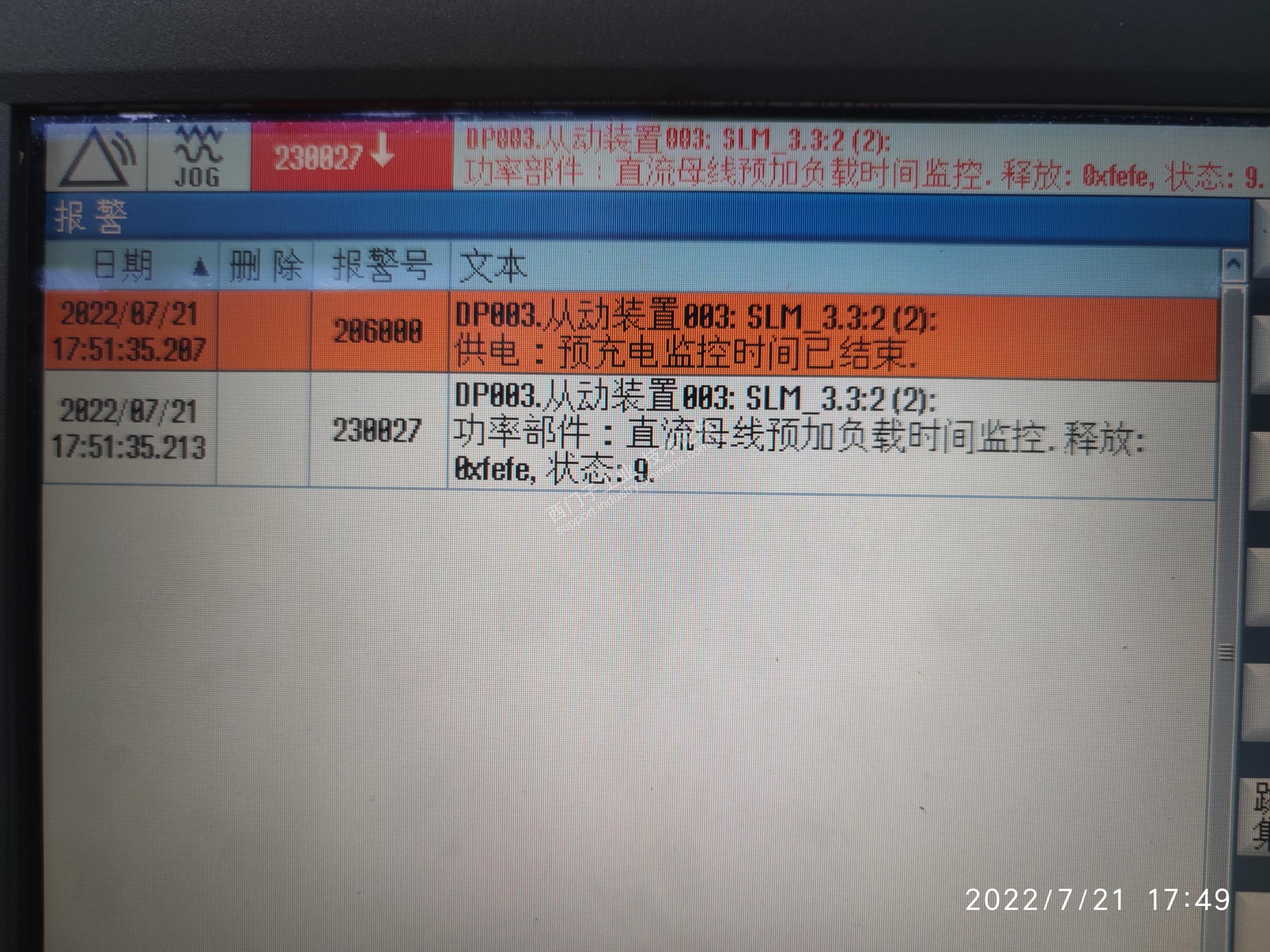 系统840DSL ,其驱动器电源模块型号为6SL3131-6TE21-6AA3,当前上电复位出现230027和206000报警,如图所示,机床使能不成功,电源模块出现故障。