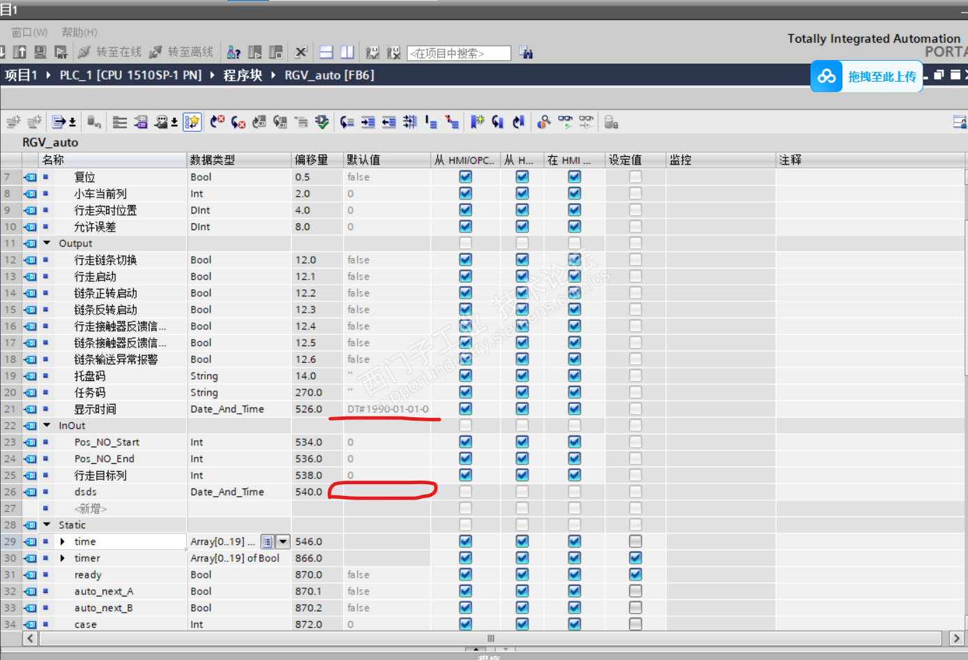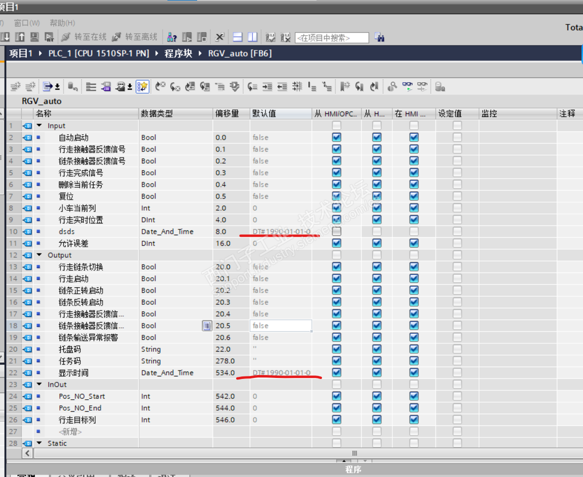 如图,dateandtime如果在输入或者输出或者静态变量里,都可以设置初始值,但是临时变量和输入输出变量里无法设置初始值,PLC上电初始化就报警,说域长度错误报警。请问这是怎么回事?有谁遇到的