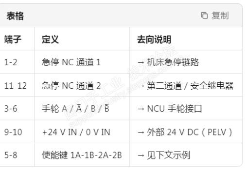 ? 端子 1 和 11 串入各自安全链,断开后立即触发 NCU 急停。