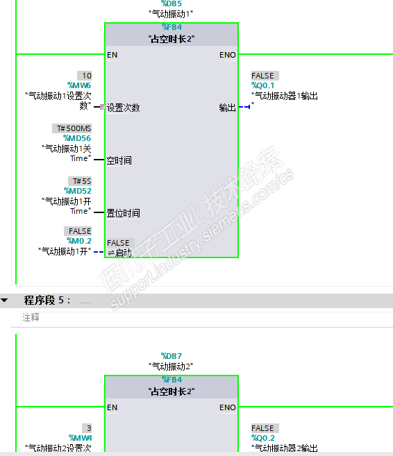 大师们指导一下,1200PLC写了个振动间隔次数的,调用2次FB块,两个FB块无法同时用,只能用一个。求解