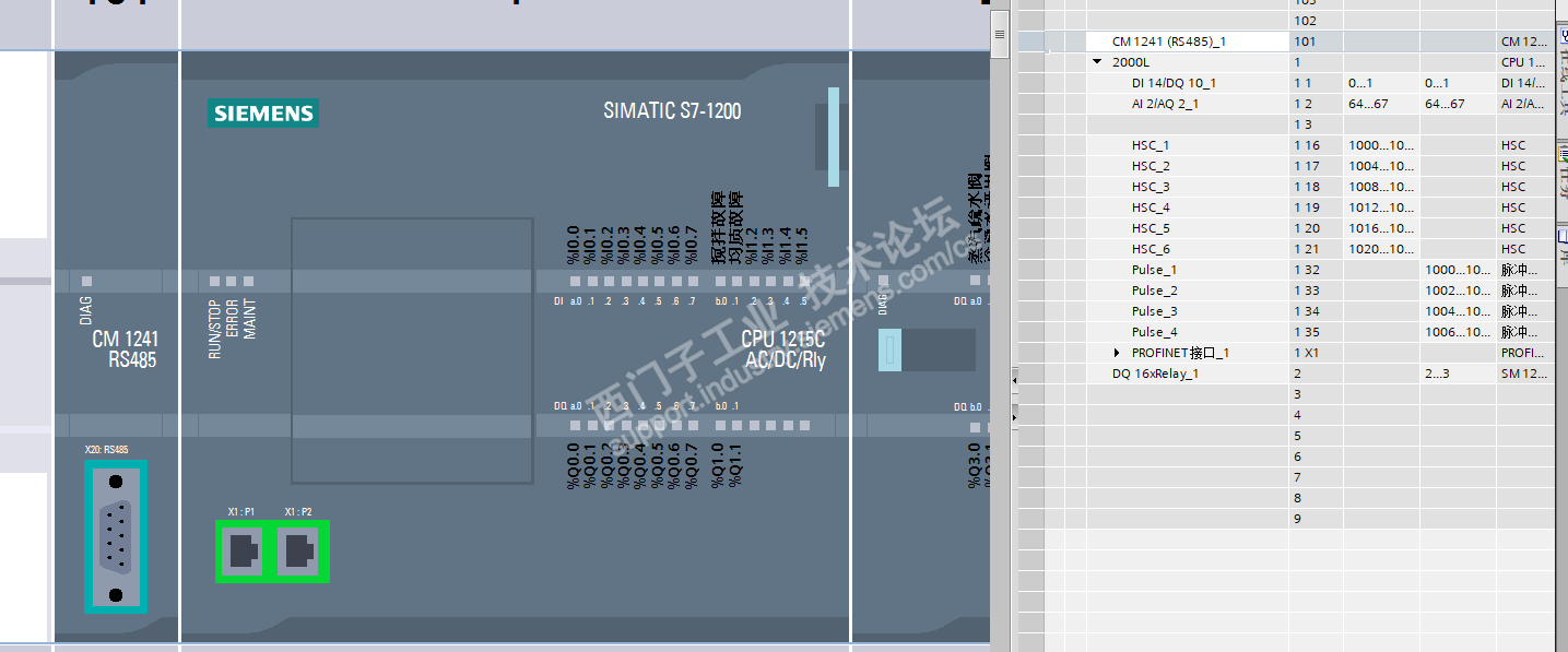 可以看到CPU左侧是一个通讯模块CM1241 RS485模块,因为这两个1200都需要添加这个通讯模块,仓库里只有一个,所以配置都是按照这个组态的,而实际手上有一个CM1241 RS485和一个CM1241 RS422/RS485,我下载组态的都是CM1241 R485,其中有一台实际配置如下图