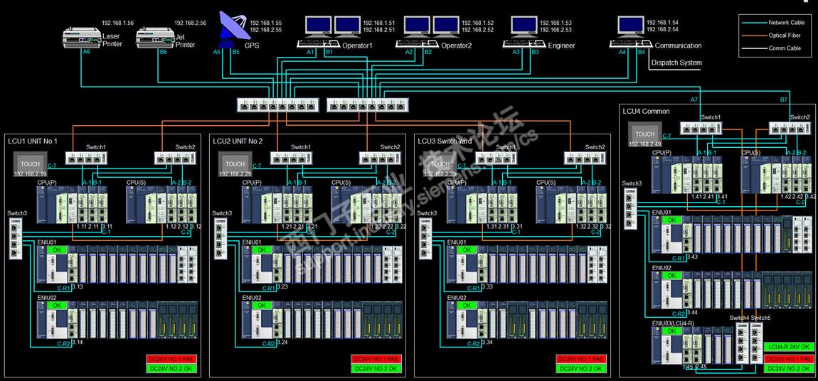 2014年在国外一个电站项目上又使用了一次GE的冗余系统,使用的是PAC3i系列,不仅CPU是冗余的,连通讯网络都是双星型冗余网络。GE的系统比起AB的来就难用一些了,光出厂冗余和IO通讯调试就让GE专家来了两次。当时的CPU和IO机架的通讯不是硬件配置完就可以,而是需要编写通讯指令,靠程序切换。在地址设置上与AB的自动+1不同,GE需要设置一个物理IP,同时设置一个映射IP,两个CPU的物理IP不能相同,但是要设置成相同的映射IP。另外一个奇葩的地方是下载程序的时候要分别给两个CPU各下载一次(冗余模块只负责数据同步,不负责程序同步)。这套系统是目前为止用过的唯一一次GE系统,难以理解为啥电力行业这么愿意用这种奇葩东西,不过价格比AB便宜不少是事实。下图是当时电站的自控和网络配置。