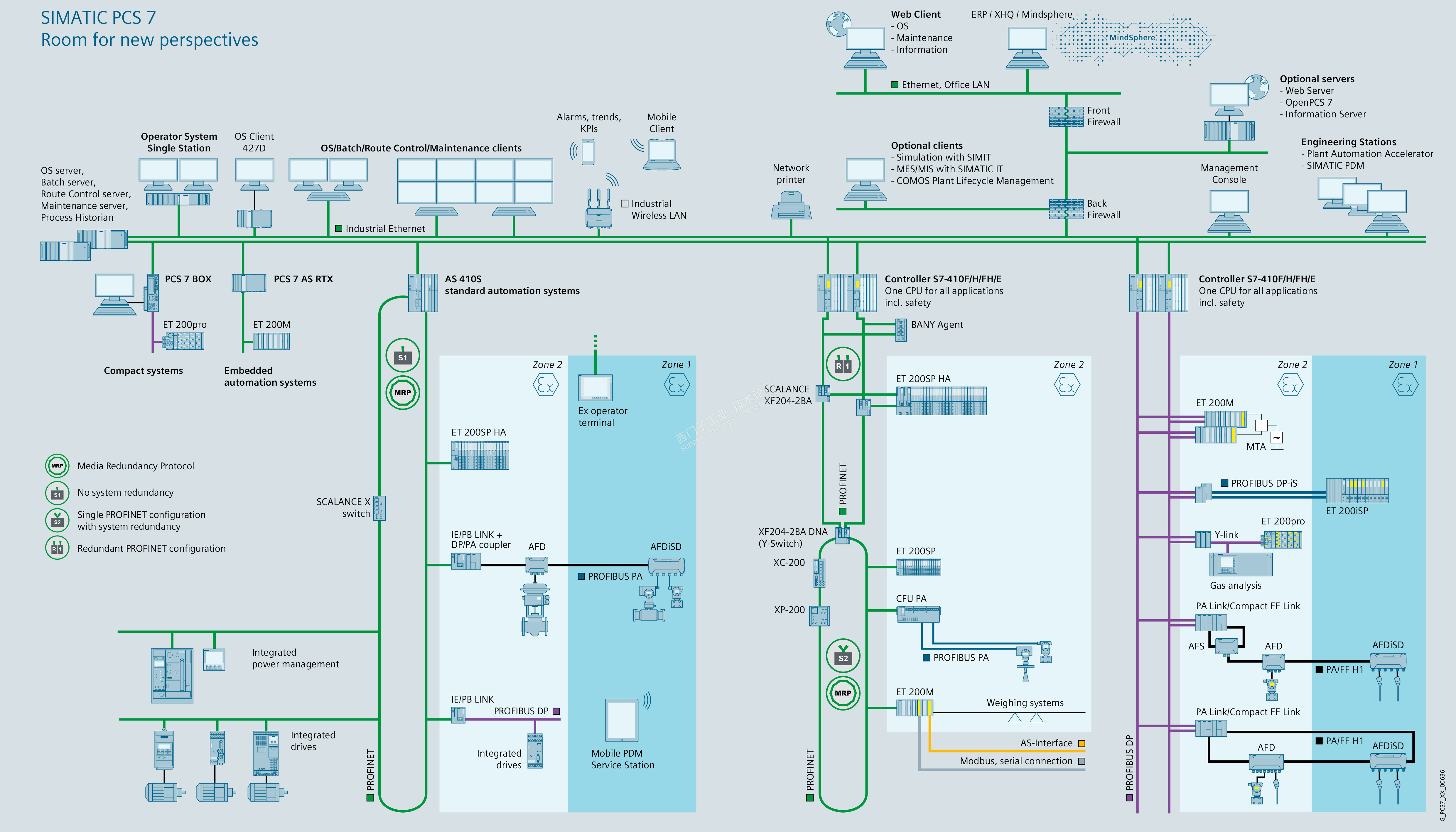 有些特殊情况下,需要采用西门子PCS7系统组成生产控制层和设备控制层,PCS7系统的组态效率和功能随着版本的不断更新也在提高和完善。在PCS7架构下,DCS系统的层级结构划分更加明确。西门子的全集成一体化概念也得到很好地验证。典型结构如下: