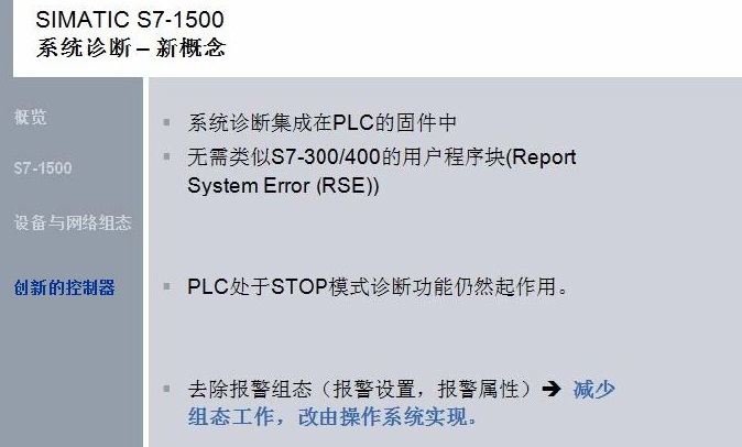 系统诊断功能不用像S7-300/400中组态RSE功能,系统诊断功能直接集成在PLC的固件中,并且当PLC处于Stop模式系统诊断功能仍然起作用——省去了组态工作。见附图: