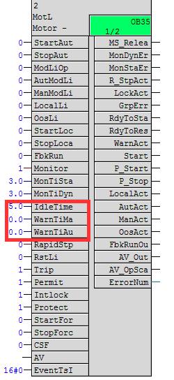 MotL的输入参数Idle Time用于设置电机的停机延时,输入参数WarnTiMan和WarnTiAut分别用于设置手动起机或自动起机时的起机延时。注意,这三个参数默认为隐藏参数。
