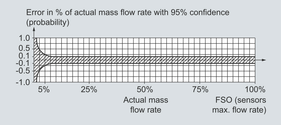 质量流量计的精度在流量计产品中是最高的,西门子的质量流量计的最高精度达到优于0.1%实际质量流量。FC030, FC300, MASS2100的精度都是0.1%, MC2精度是0.15%。这只是对于精度泛泛的描述,当然任何流量计在流量低到一定程度,精度都会下降的,质量流量计也不例外,上面标称的精度一般都是指流量大于最大流量5%时的指标,当流量小于最大流量的5%又遵循什么样的规律呢?下面一MASS2100,FC300为例,说明质量流量计的精度曲线,如下图。