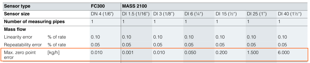 对于不同口径的质量流量传感器都有最大零点误差指标,如下表所示: