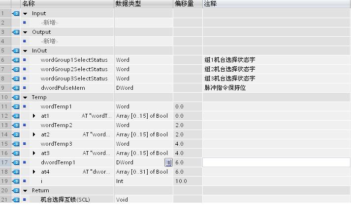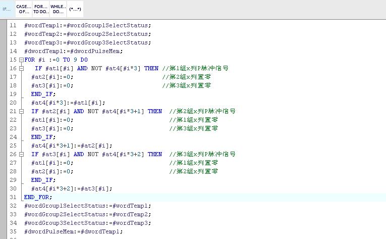 使用AT指令主要是为了取得类似“变址寻址”的效果,即通过改变数组下标值达到操作数据不同位的效果,在循环指令中比较有用,如下例,采用循环语句判断组0~9位是否有上升沿指令,如有则将另外2组相同位置零。