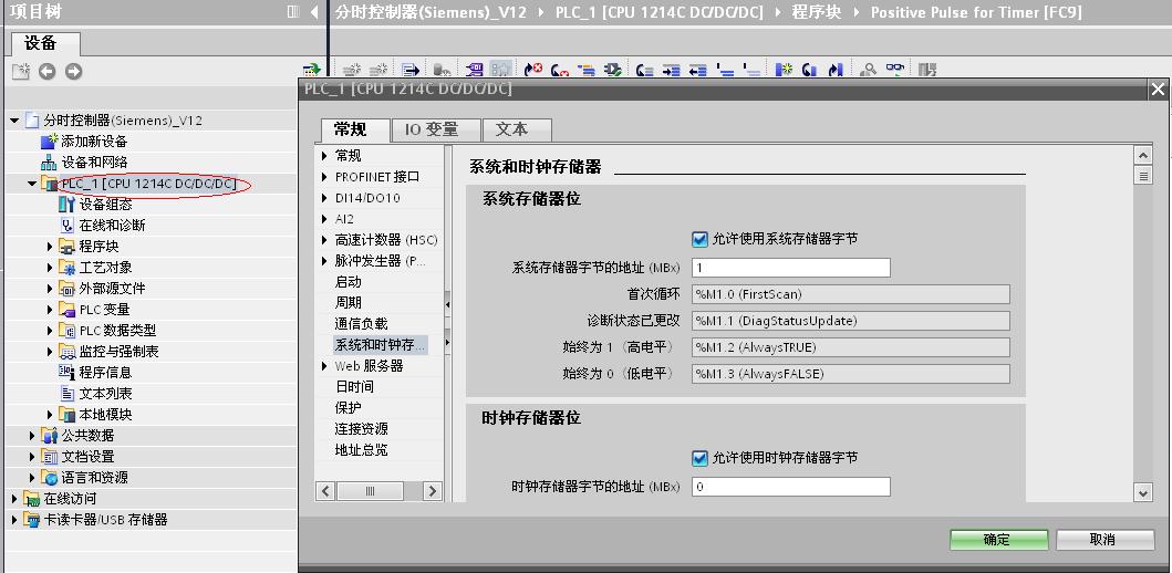 1、设置系统时钟存储器字节并激活,方法是:在项目树 PLC名称项上右键单击->选择“属性”以打开PLC系统属性设置对话框->选择“常规”选项卡->选择“脉冲发生器(PTO/PWM)”下的“系统和时钟存储器"->设置并激活系统时钟存储器位,如下图所示,M0.0即为10Hz脉冲,其符号为”Clock_10Hz";