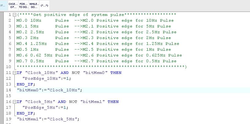 2、对时钟脉冲取上升沿,为以后在程序中计数作准备。下例中是将所有时钟脉冲取上升沿程序在FC中定义,方便程序的移植,如下图所示,10Hz脉冲上升沿为M2.0,符号为“PosEdge_10Hz”,是在系统变量表中定义;