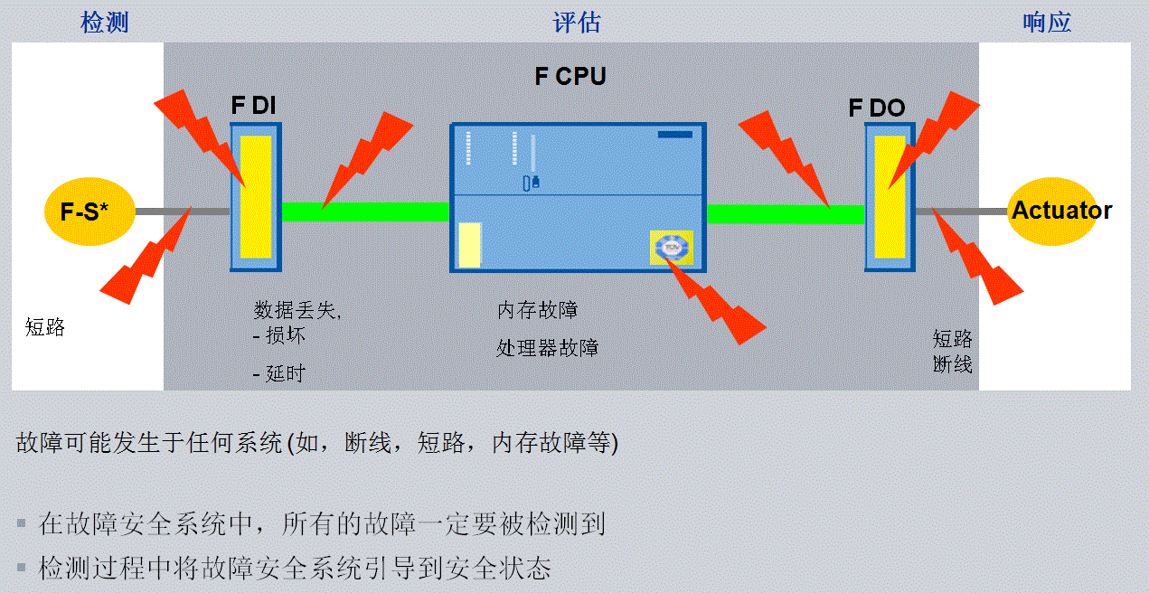 任何电子元器件都有寿命,而且都有可能在某些时刻失效,有些情况下功能的失效是很危险的,对于这种失效我们称之为危险失效。首先要强调的是故障安全系统的产品并不是不失效,而是做为安全产品失效时是能够被系统监测出来的。换句话说失效不可避免,不怕失效,关键是能够检测出来,而且将系统通过一定的机制导向安全输出,避免危险失效造成的危险发生。从上图可以看到,控制系统从检测、评估到响应的各个环节都有各种各样的失效发生,而故障安全系统能够检测到这些失效。