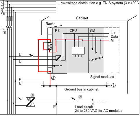 看红色的指引线,在缺省的情况下,CPU的逻辑地M与PE是连通的(上面说过拨开背板的连接片就与PE隔开了),PE上的干扰会影响到这个系统的逻辑参考点。那么再看看I/O模块的信号是否可以影响到M呢,参考下图。