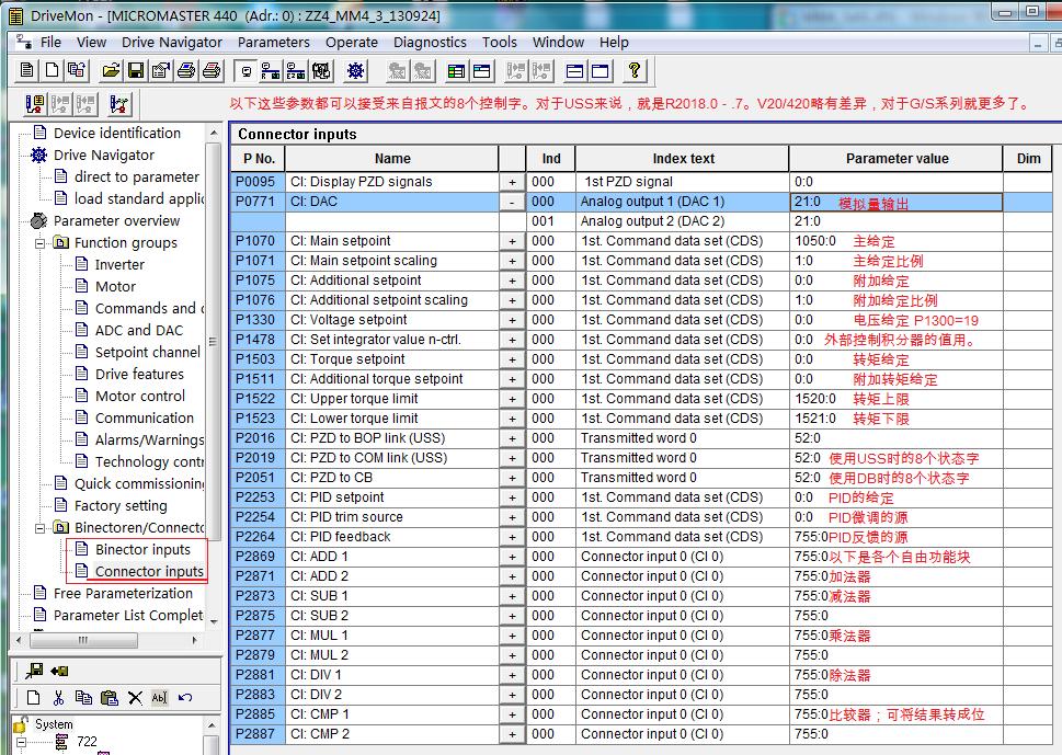 我没有列出BI(位控)参数,这是因为MM440不支持报文对于位的控制(只能使用控制字2中没有用的位、或者使用比较器。)如果你想使用一个控制字(16位)来控制变频器16个开关量参数;只能选用G系列或S系列了。