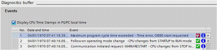 切换到在线模式后,双击项目树中的“在线和诊断”,在工作区打开在线与诊断视图(见下图)。选中某个事件,事件列表下面给出了该事件的详细信息。