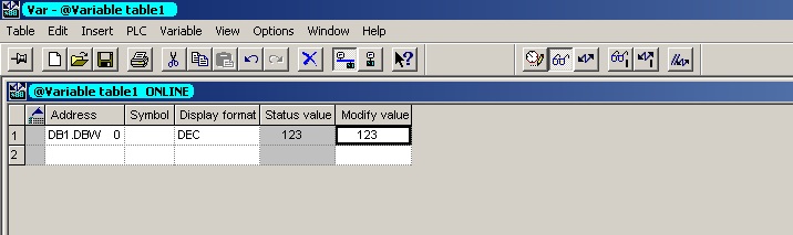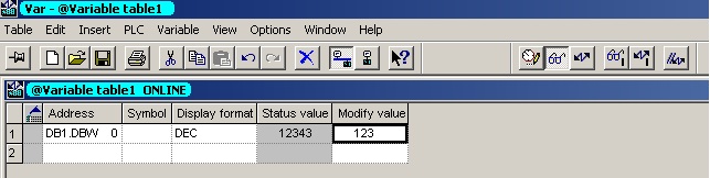 1.设置DB1.DBW0的初始值为12343,在变量表中在线修改其过程值为123