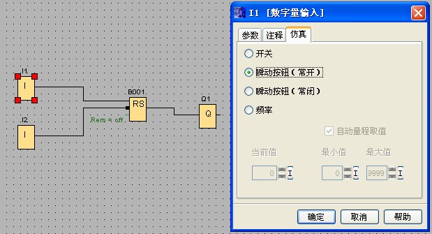 非常简单:您可以用“RS触发器”(即:锁存继电器 默认:断电不保持) ,启动按钮的常开点接I1,程序中I1连接“锁存继电器”的置位端S;停止按钮的常闭点接I2,程序中I2取反后连接“锁存继电器”的复位端R即可。仿真前分别打开(可双击打开):I1、I2 的“块属性”对话框,再单击“仿真”打开仿真参数设置对话框,设置“仿真”时I1及I2分别为“瞬动常开”及“瞬动常闭”。 如下图:
