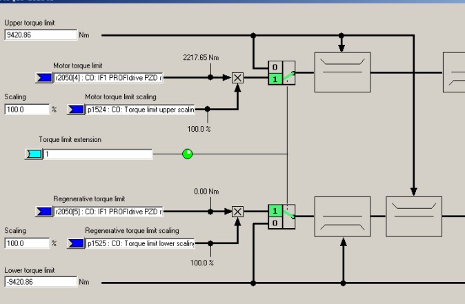 第四张是用TRACE录制的波形,绿色线是PLC的速度给定R1073,蓝色线是斜坡发生器输出的速度给定R1150,黄色线为未滤波的转矩R80.0