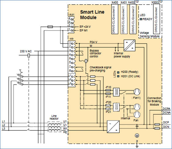 SLM Chassis -- X9端子排5和6两端子控制预充电的合分,3和4两端子控制”Bypass Contactor”的合分。预充电先闭合,1-2秒之后直流母线达到80%,在X9端子排7和8两端子得到”预充电完毕”的反馈,然后进线断路器合闸送电。