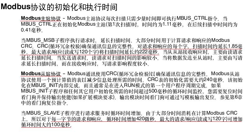 modbus-RTU通讯试验,传递一个位的开关量信息,这个开关量物理上我有意接到了两台PLC上,在200中做程序检测该开关量上沿和通讯传递过来的位信号(Q0.1)上沿的时间差,CP1E中做程序是通讯尽可能快的发送该开关量的信息到200的Q0.1,在38400波特率的情况下我在200中监测到时间差30-60毫秒,肉眼可分辨出输入开关量的指示灯比Q0.1的指示灯先亮或先灭。这个滞后对于有些需要快速响应的场合可能构成问题。后查了手册,发现通讯计算CRC校验码是比较耗时的,且200主从站库计算方法还不一样,主站就耗时多些。另外CP1E的CRC校验可能也比较耗时,这些因素累加在一起导致开关量信息从物理产生开始到通讯成功传输到200耗时不少。