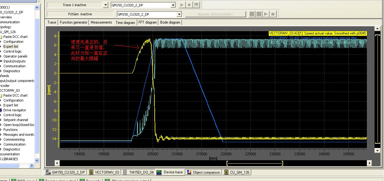 2.在不带编码器的速度闭环模式,给定正的,反馈还是负值,力矩达到正向限幅: