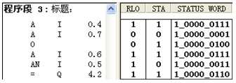 实际上,程序段的第一条指令或逻辑串的第一条指令并不执行什么逻辑运算,第一条A、O、X指令只是将指令中的位变量的值传送到RLO,第一条AN、ON、XN指令将指令中的位变量的值作“非”运算后传送到RLO。