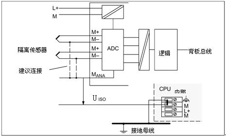 这种方式最简单,都与地隔离,都不需要接地,但是输入信号(传感器)负端与MANA 电压超过UCM最大限制,例如SM331(6ES7331-7KF02-0AB0)为2.5 VDC,就需要短接信号负端与MANA ,否则会出现超上限问题。现场可以查看一下,几乎所有超上限问题都是没有连接信号负端与MANA 。如果UISO 超过限制,例如75V DC,就需要连接信号负端、MANA 端以及接地端M,这时模块以大地M端为参考电位,实际变为非隔离使用了,这种情况很少见。