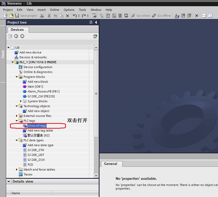 在项目中打开PLC tags 目录,双击打开Show all tags ,如上图红框所示。