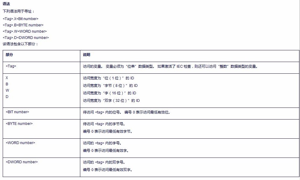用户程序要访问声明变量内的数据区域,可以通过附加声明来覆盖所声明的变量。 这样,可以选择对不同数据类型的已声明变量进行寻址。例如,可以使用 BOOL ARRAY WORD 数据类型变量的各个位寻址。