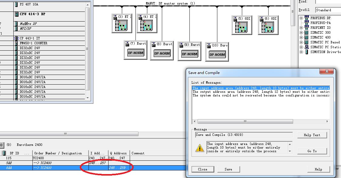现场有一台400的CPU,通过PROFIBUS下面挂了几个从站,其中有四个从站是欧陆的仪表。在打开上载到电脑的硬件组态后,点编译显示如图所下的谈窗口。