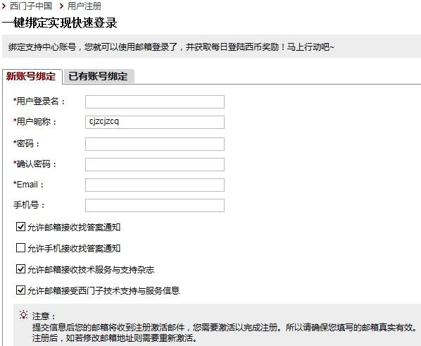 4、在随后出现的“一键绑定实现快速登录”界面中,如果用户还没有SIEMENS网站技术论坛的注册账号,则选择“新账号绑定”标签去填写和完善注册信息。