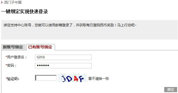 5、如果用户已有技术论坛的注册账号,则选择“已有账号绑定”标签,正确输入用户登录名、密码和验证码,随即完成绑定并登录了。