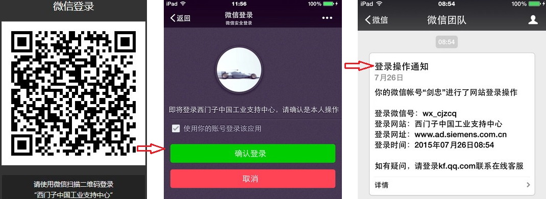 6、如果用户选择“微信”图标,则需要借用智能手机或平板电脑并进入微信应用,扫描界面中出现的二维码,就完成绑定并登录了。在绑定并登录成功后,“微信团队”公众号会推送一条“登录操作通知”提示信息于手机或平板电脑上。