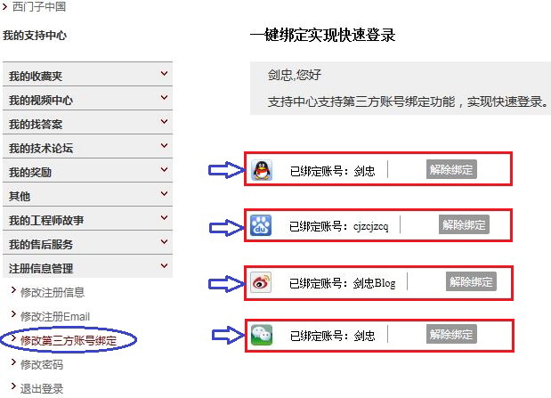 8、如果要查看或更改绑定登录的社交工具,则进入“我的支持中心”点击“修改第三方账号绑定”,即可查看和实现绑定变更。