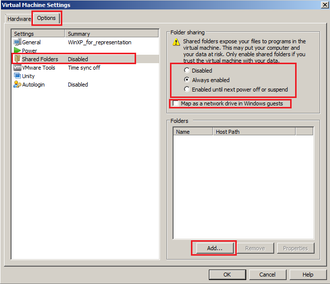 注意选择 Option 页,然后点击 Share Folder,右边单选框选择Always enable。注意途中画红框的部分,点击 Add 添加需要共享的主机目录,然后OK。这样就可以实现主机与虚拟机共享目录了,也就是说可以主机与虚拟机通过共享目录的方式,实现文件互传。