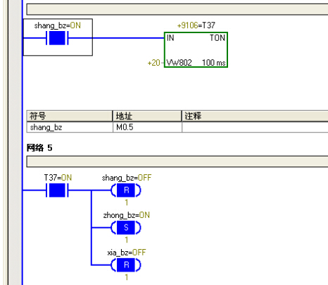 在S200 中用三个定时器,构成类似红绿灯的循环。但是出了问题,很奇怪的是,如下图中M0.5(shang_bz),一个是OFF状态,一个是ON状态? 这是什么原因呢?