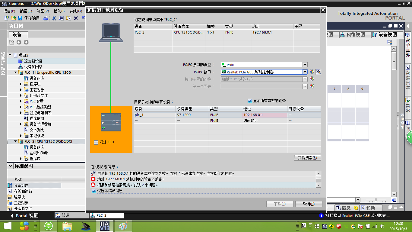 TIA V13 SP1建立新项目硬件组态后搜索设备正常 ,下载时出现设备不兼容情况,如下图。检查硬件版本无误。通过自动检测的方式,获取PLC的信息,出现无法连接的错误。如图2。各位大侠,给个提示,谢谢!