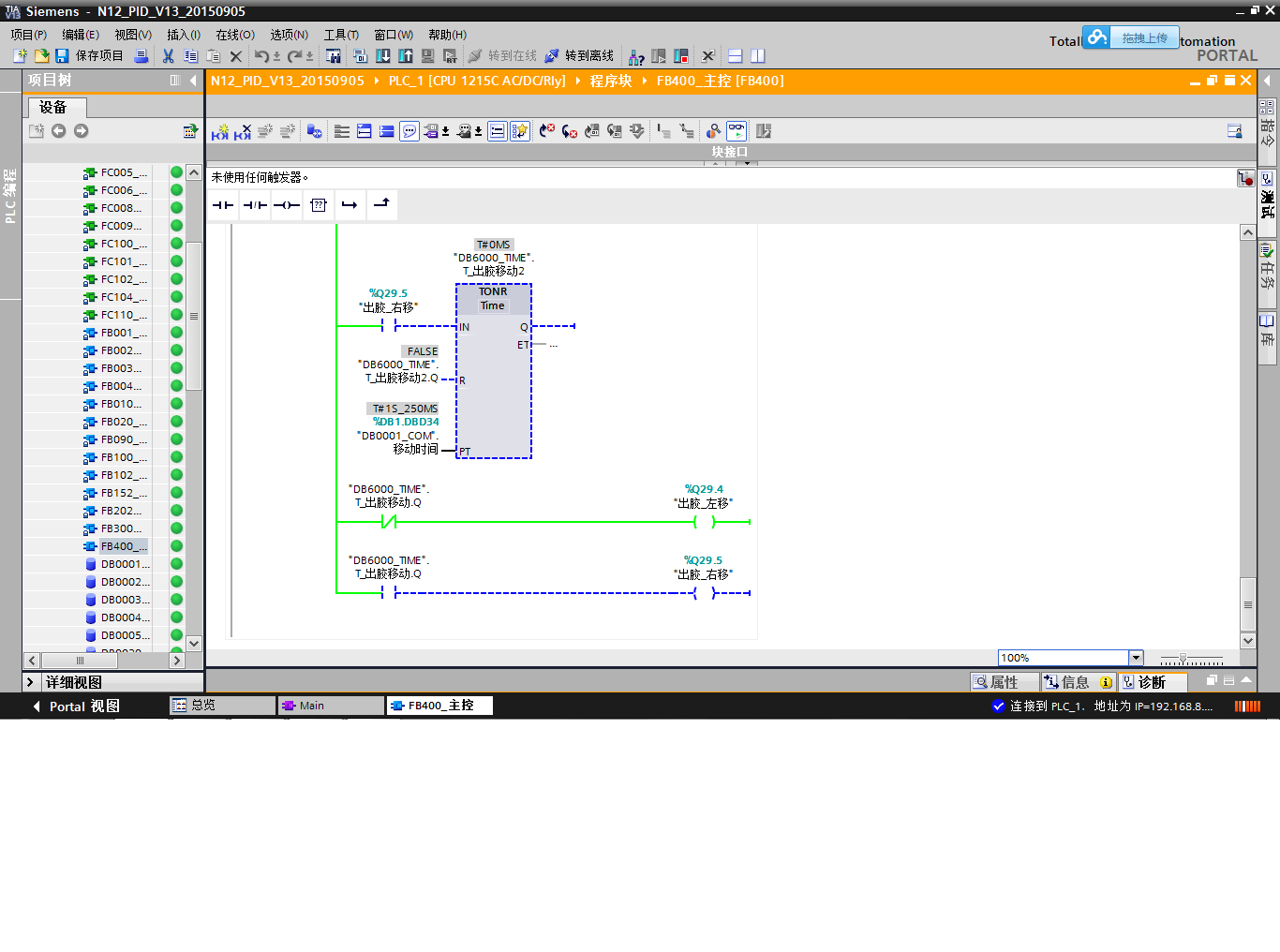 I20.7接通后第一个TONR定时器(DB6000_TIME_T_出胶移动)开始计时,Q29.4输出为ON。第一个定时器时间到达后为Q29.4输出为OFF,Q29.5输出为ON,