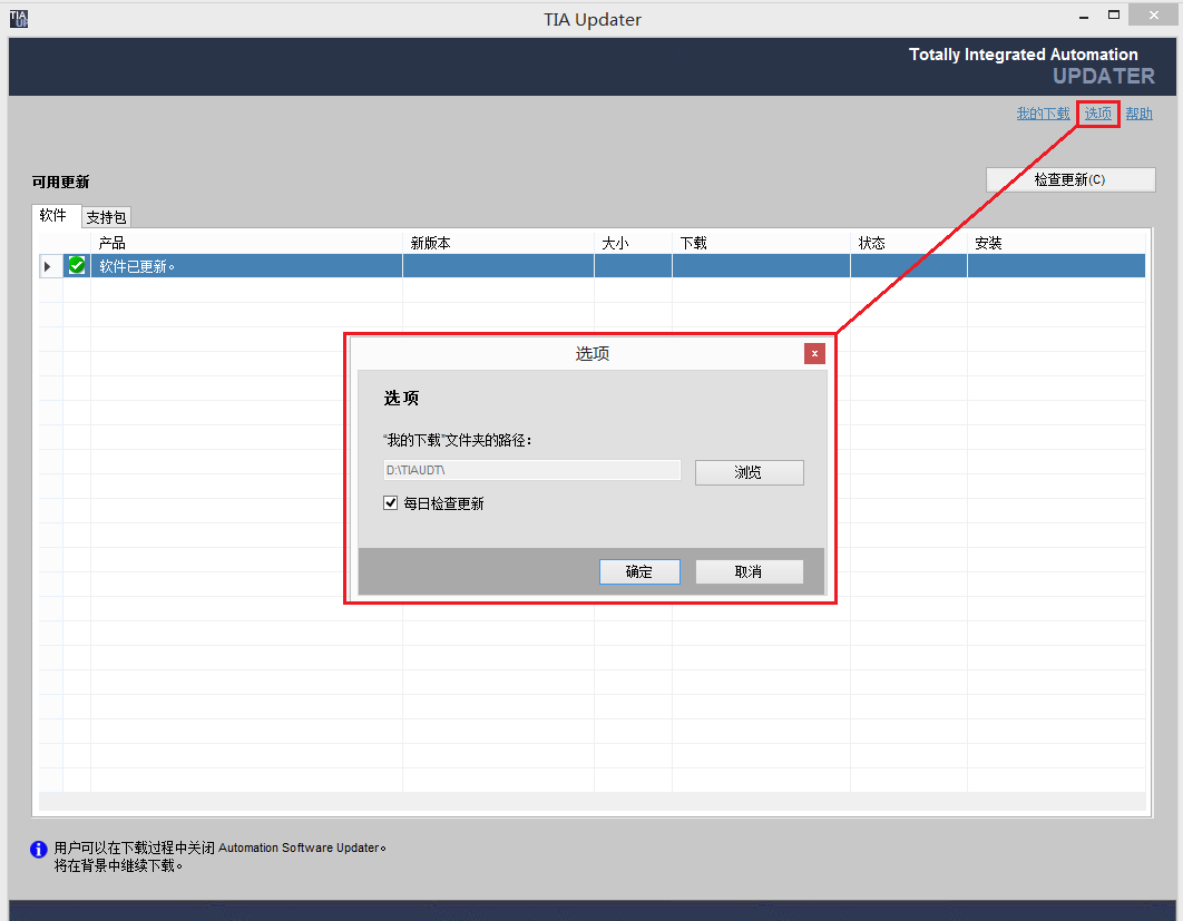 右上角选项中指定下载的路径,全路径不要有中文等大字符集名称;可以建个单独文件夹如"TIAUPD"之类,所有的都放在那里。