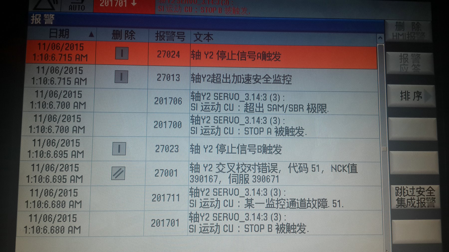 上午设备运行时频繁出现27024、27013、201700、201706等报警,报警信息如图所示: