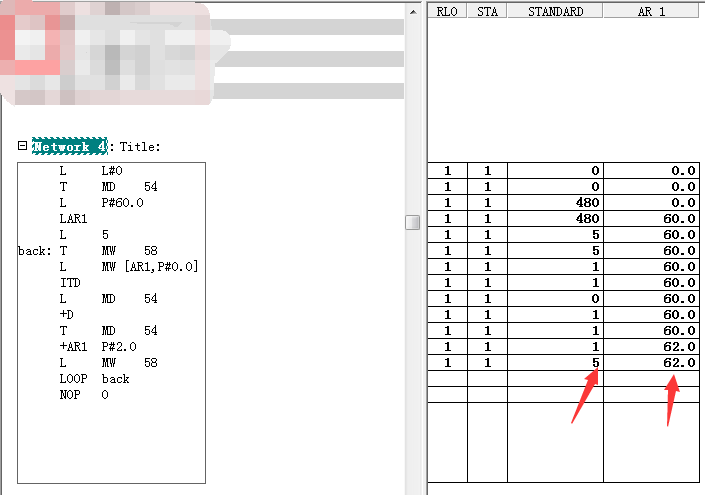 刚刚使用间接寻址,不太懂,希望大伙教我, 下面的累加程序工作正常,只是我不能理解的是我监控的时候 总是监控不到AR1里面的数值变化,应该在循环的时候 一直改变的 无论指针,还是AR1,为什么监控不到,或者怎么监控?谢谢 而变量表里面监控的一直是mw58=1
