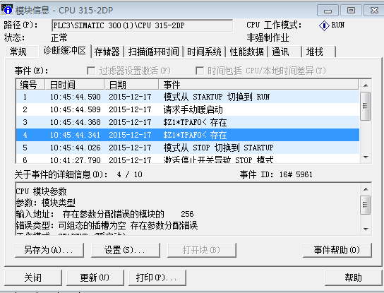 在step7 5.5 对300 CPU-315 2-DP实验的时候,故障诊断信息 $SZ1*TPAF0< 存在是什么意思?