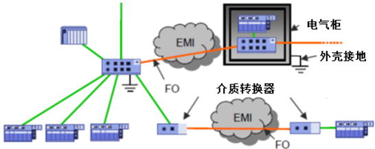 7. 电缆用于一般场合的设备连接,光纤用于网络节点和控制柜中交换机的连接,建议在电磁干扰的区域使用光纤(FO)连接,可以完全消除电磁干扰(EMI)的问题。图显示了电缆连接与光纤连接的应用。