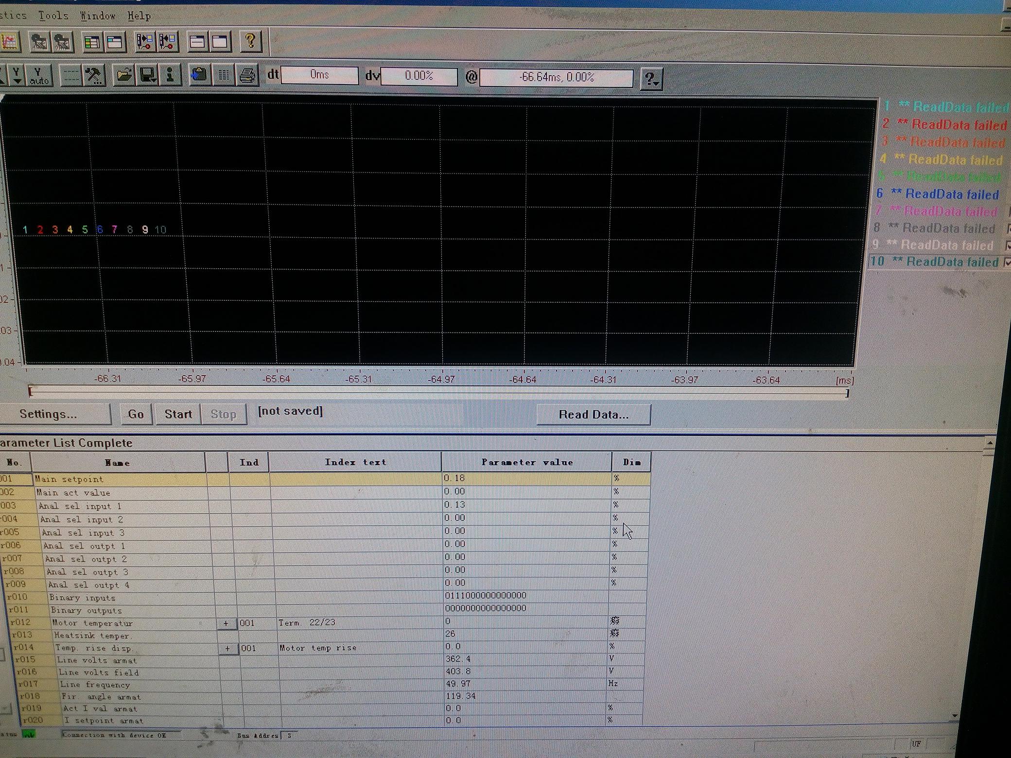录波界面,点Settings,里面的参数能读取,点start,显示开始录波,读出来如下图,以为是软件问题,drive es也重新安装了一边,还是不行
